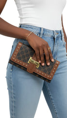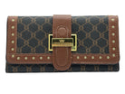 Billetera clásica con broche frontal diseño sofisticado con textura combinada y cierre de herraje metálico. Amplios compartimientos para billetes y tarjetas. Ideal para mujeres elegantes que buscan estilo y funcionalidad.