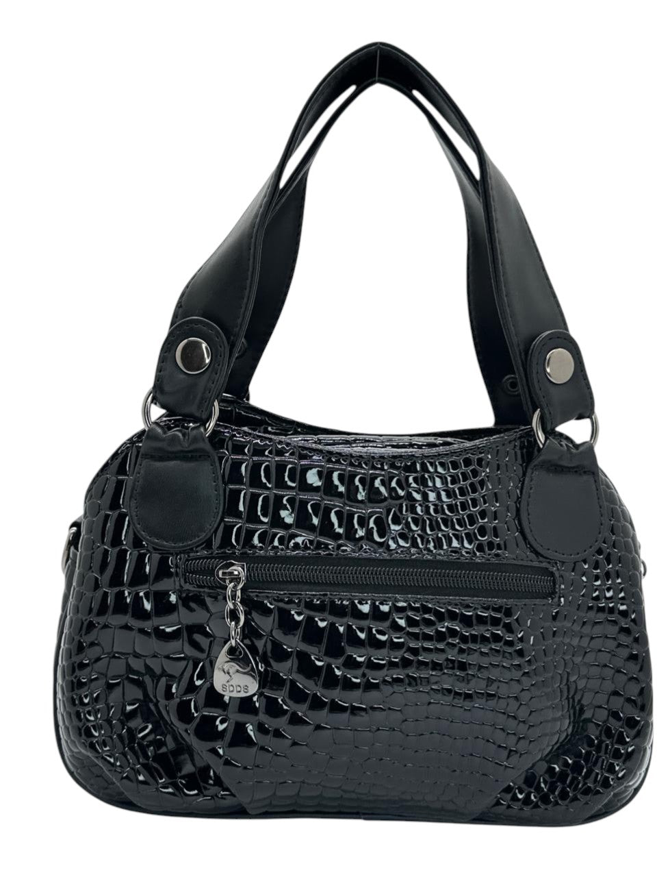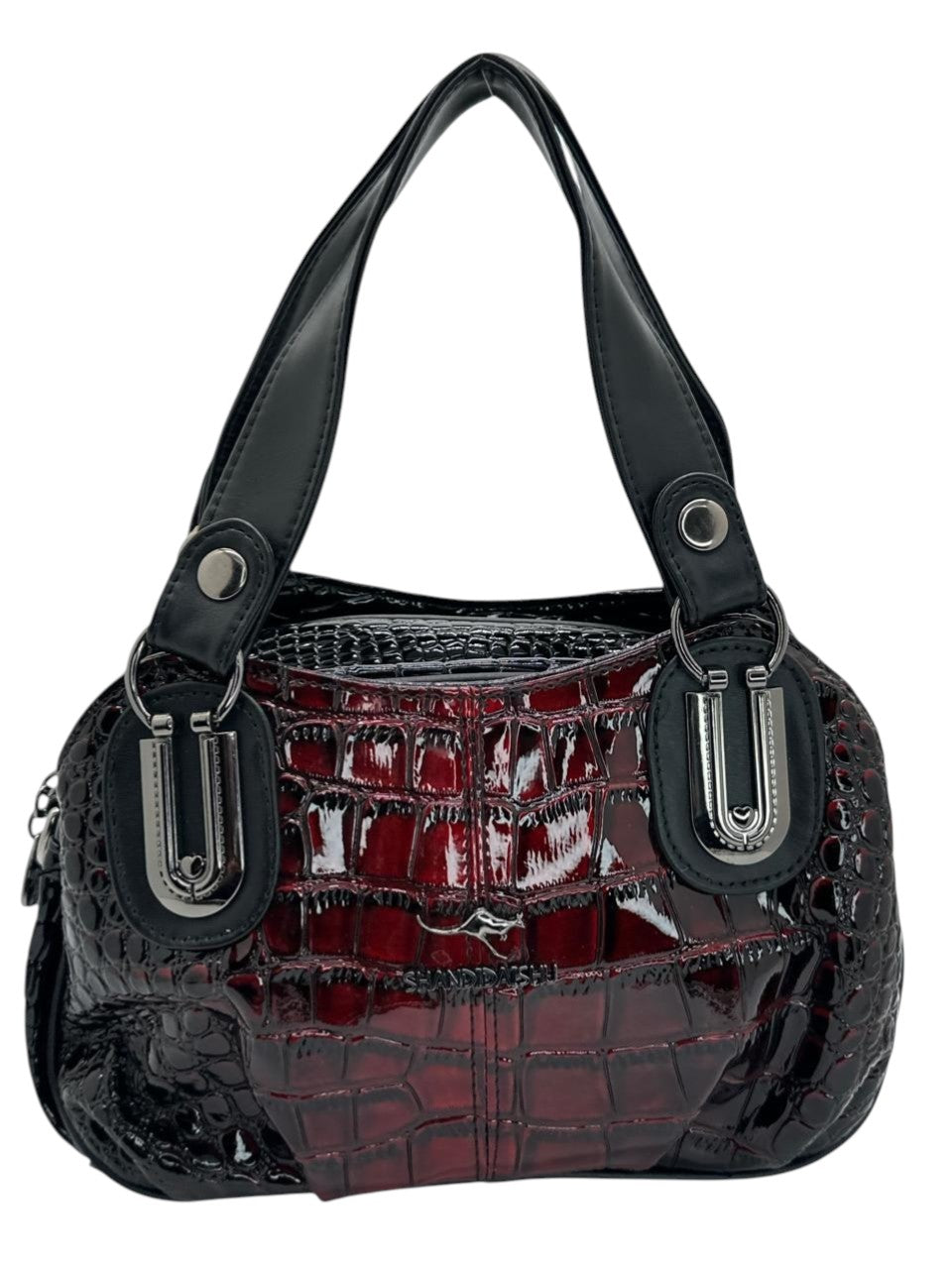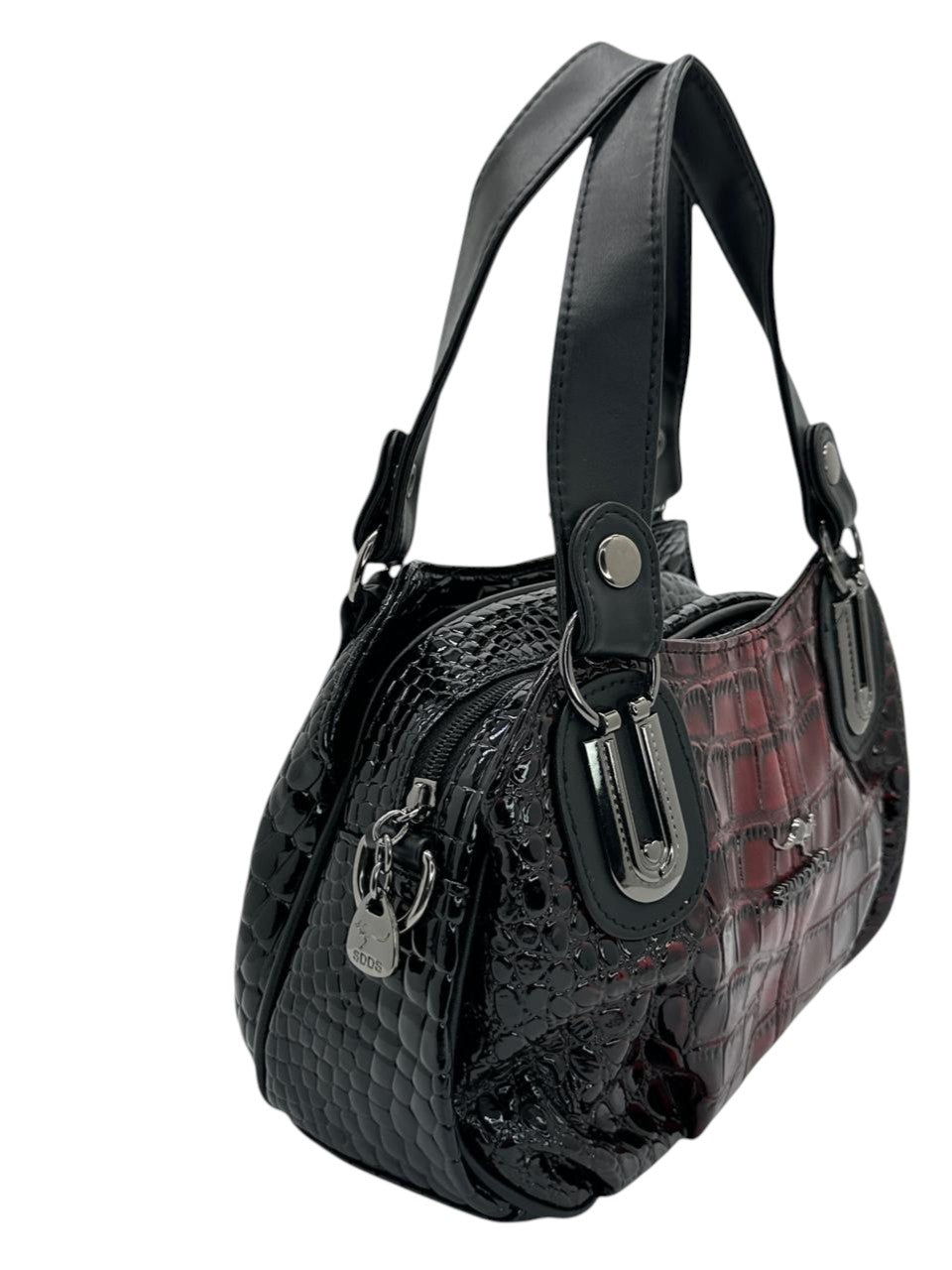 Bolso en cuero vegano de alta calidad importado, con acabado texturizado tipo coco en degradé vino y negro brillante. Asas amplias en tono negro con herrajes metálicos plateados que aportan carácter y modernidad. Diseño sofisticado, ideal para elvar cualquier look.