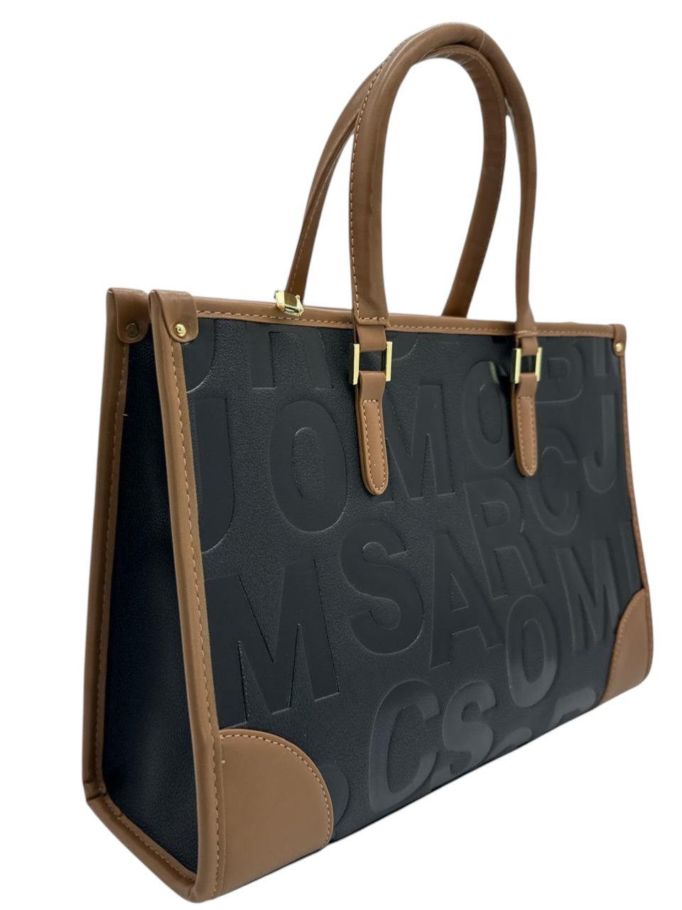 Bolso en cuero vegano de alta calidad importado. Con diseño grabado y relieve en contraste en tonos negro y cámel. Asas estructuradas y detalles metálicos dorados que aportan elegancia y firmeza. Amplio y sofisticado, ideal para el dia a dia on estilo