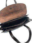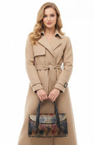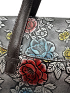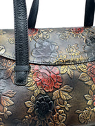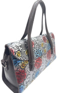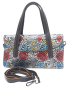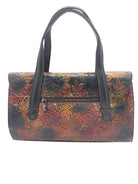 Bolso floral estructurado en puro cuero. Diseño rectangular firme con doble asa y correa larga. Estampado floral en tonos oscuros.