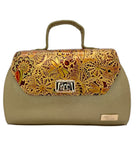 Bolso elaborado en puro cuero, con tapa repujada y pintada a mano por artesanos colombianos, donde cada diseño floral es trabajado cuidadosamente para lograr una pieza única e irrepetible. Su combinación de texturas y tonos naturales resalta la riqueza del trabajo manual y el carácter exclusivo de cada diseño.