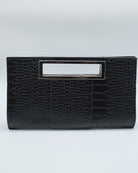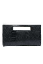 Bolso Tipo Clutch rígido moderno. Diseño cuadrado con cierre metálico rectangular. Textura de líneas grabadas.