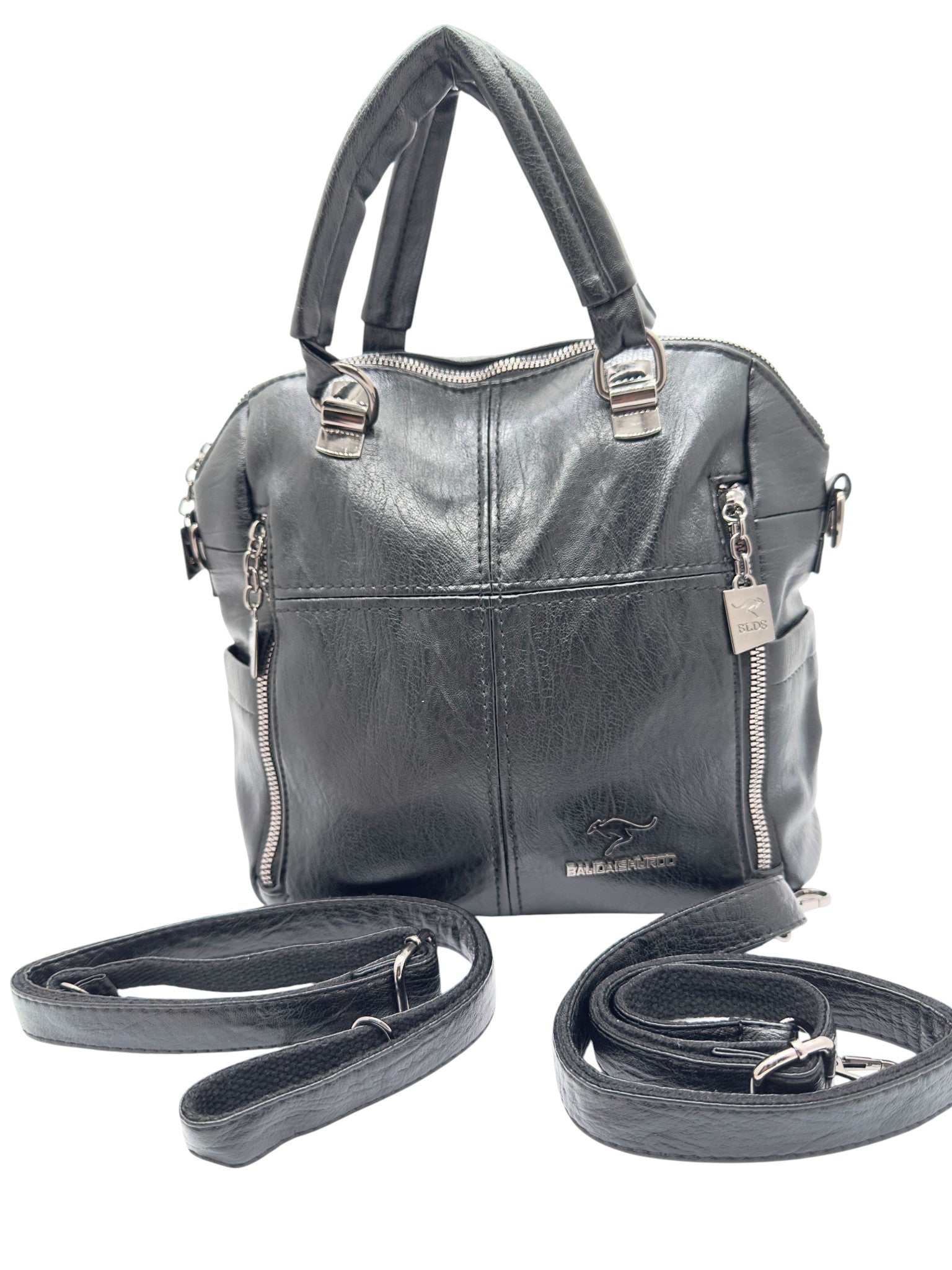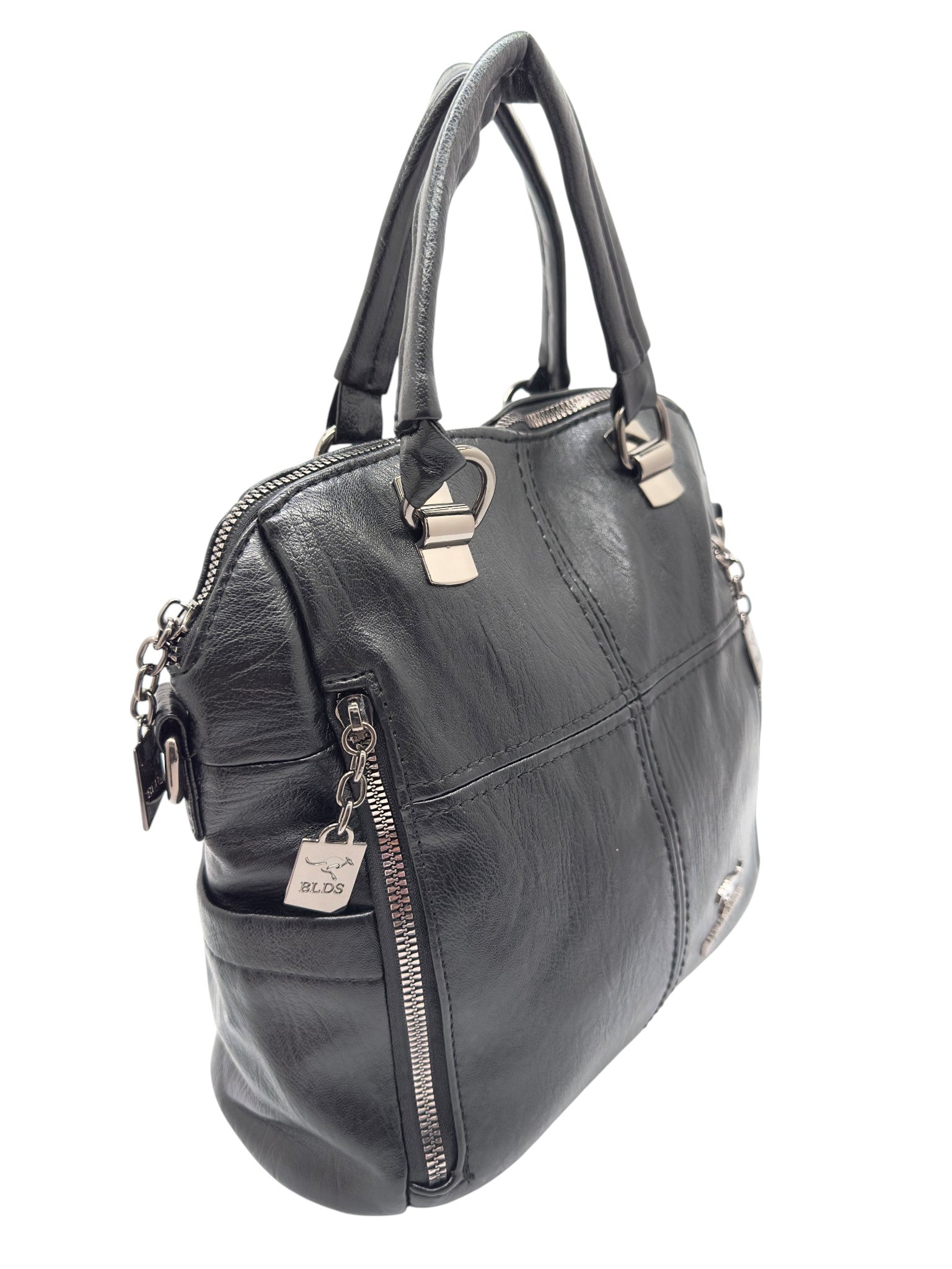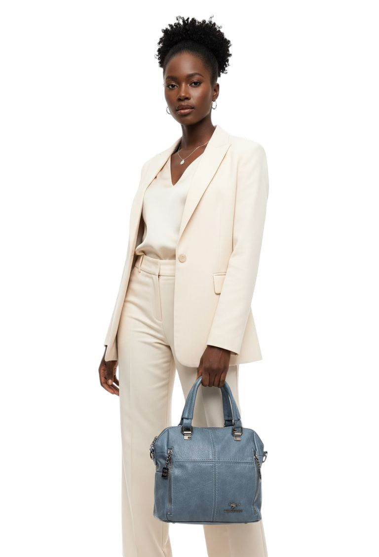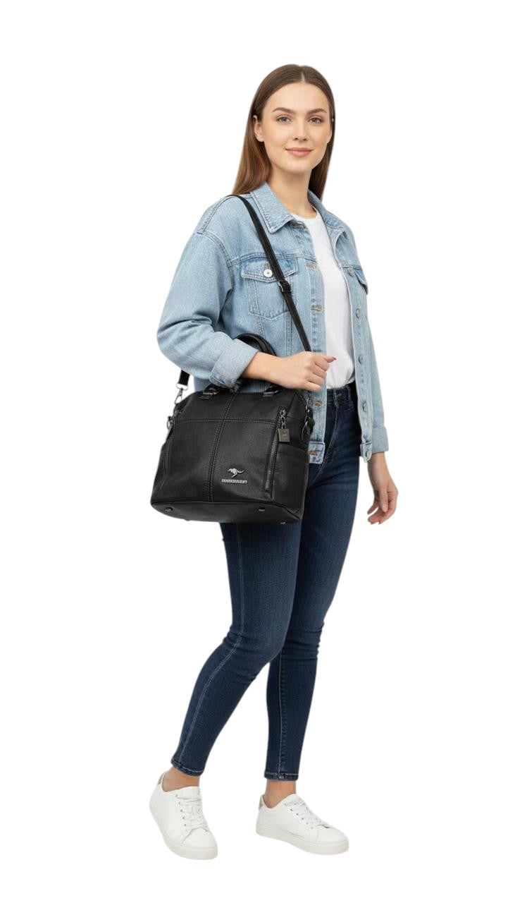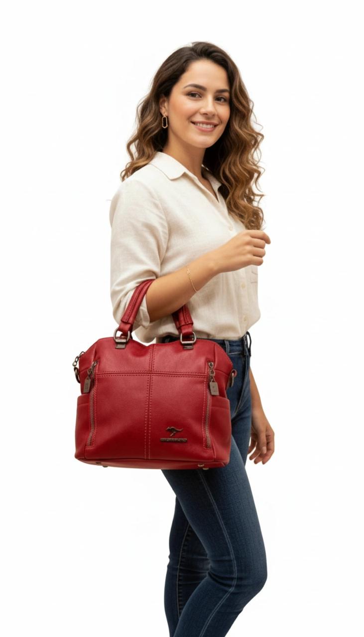Bolso en cuero vegano de alta calidad importado. Estructura firme, doble asa y correa desmontable. Diseño moderno con herrajes plateados.
