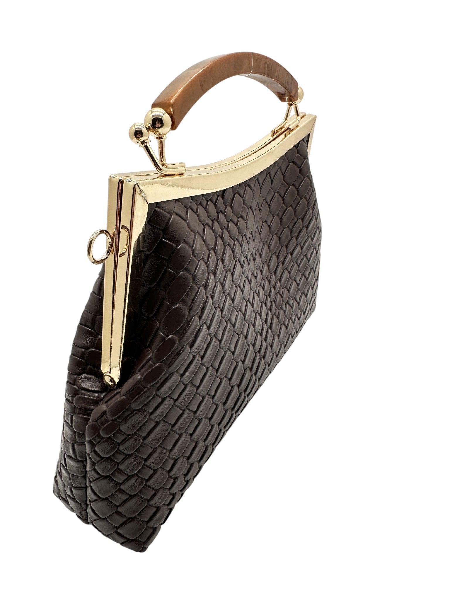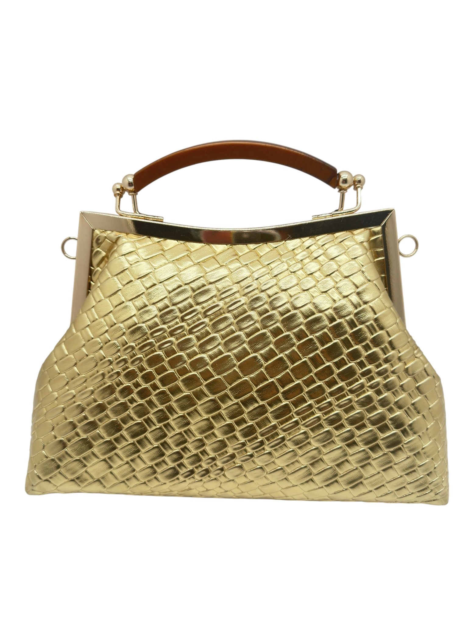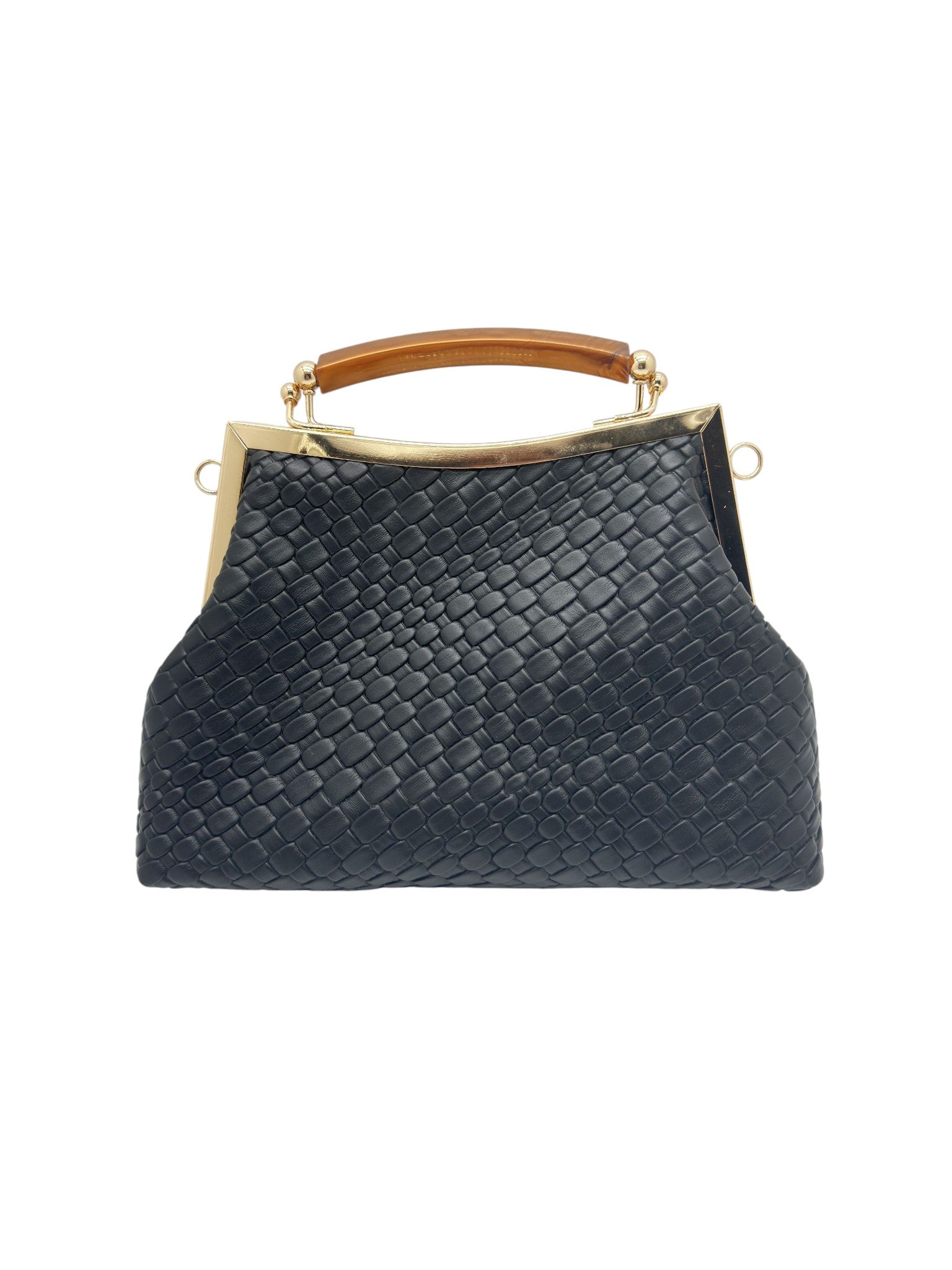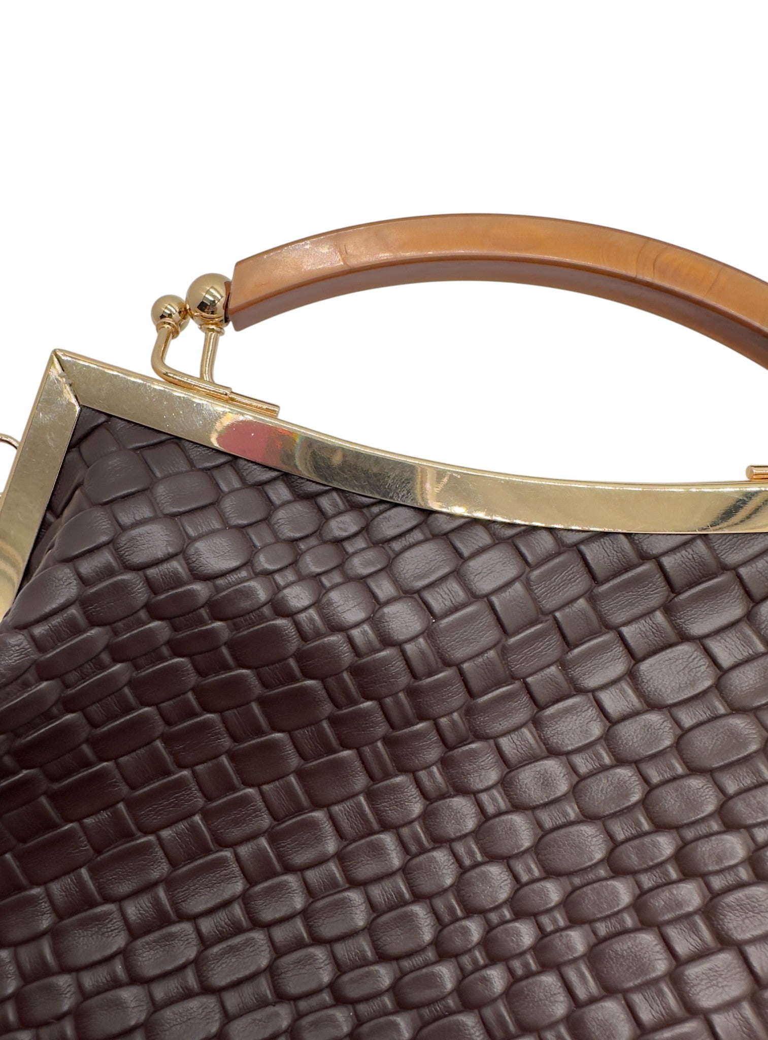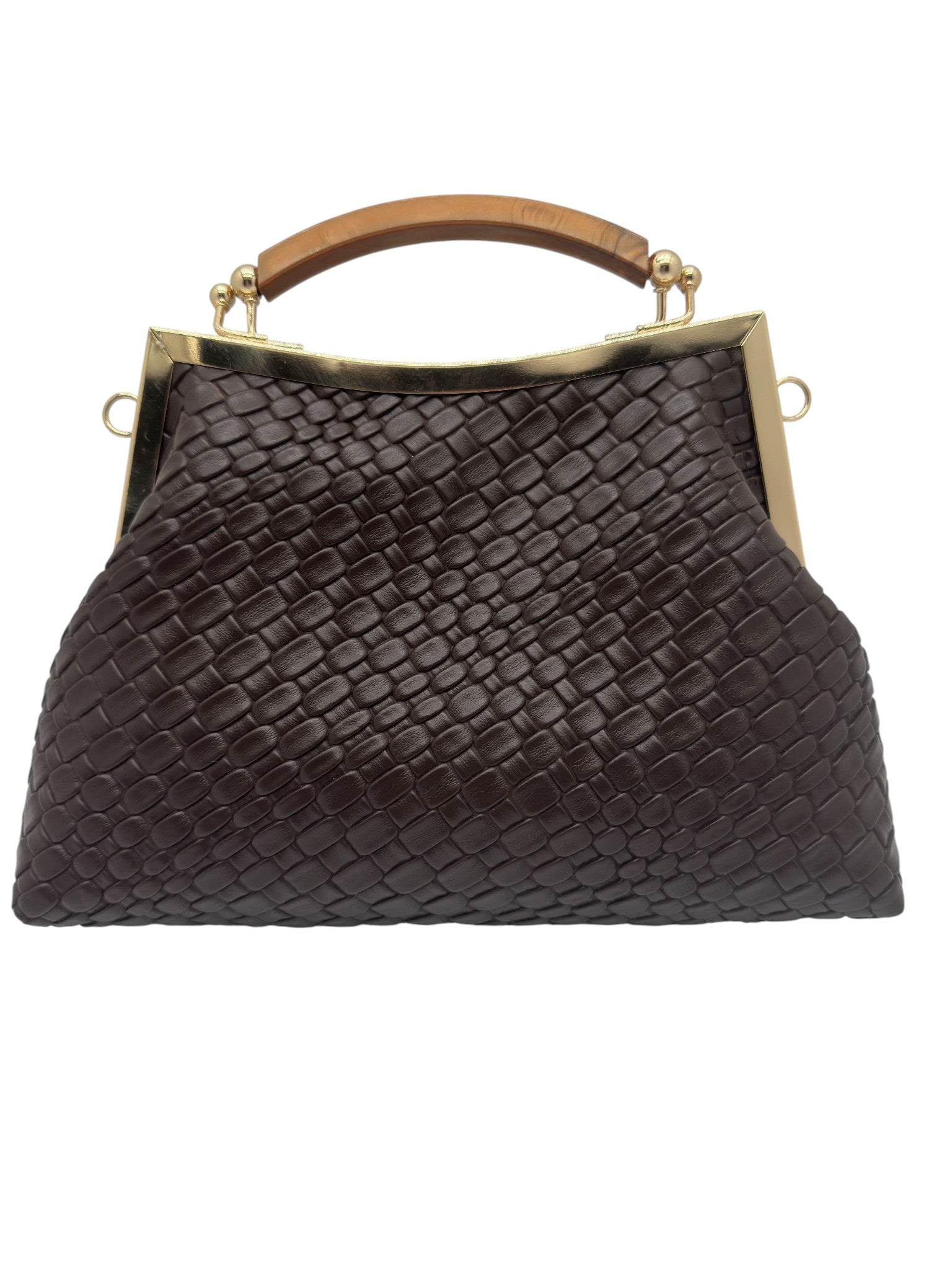 Bolso en cuero vegano de alta calidad importado Estructura rígida con asa superior y correa larga. Textura grabada tipo cocodrilo. Herrajes metálicos dorados.