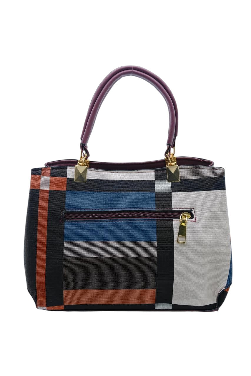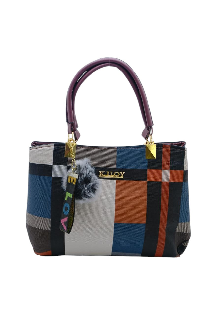 Bolso en cuero vegano de alta calidad importado Diseño rectangular con paneles de colores contrastantes. Doble asa firme y correa larga desmontable. Detalle decorativo colgante.